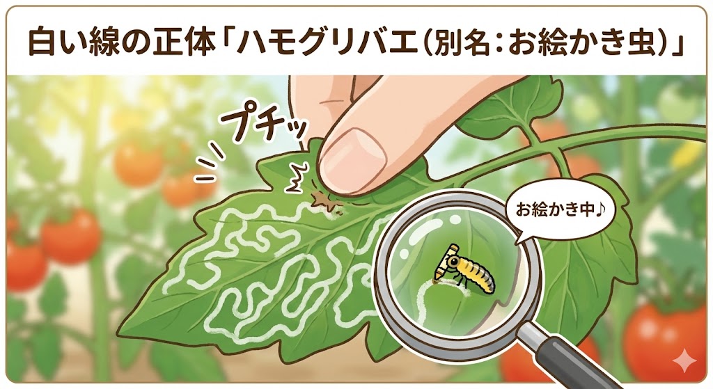 トマトの葉を観察していると、緑色のキャンバスに白いペンで「ぐちゃぐちゃっとした迷路」のような線が描かれていることがあります。
