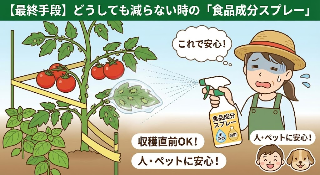 もっと手軽なものとして、「お酢」を原料にしたスプレーもホームセンターや100円ショップで販売されています。 これらは殺虫効果だけでなく、病気の予防や、トマトへの活力補給にもなる製品が多いです。