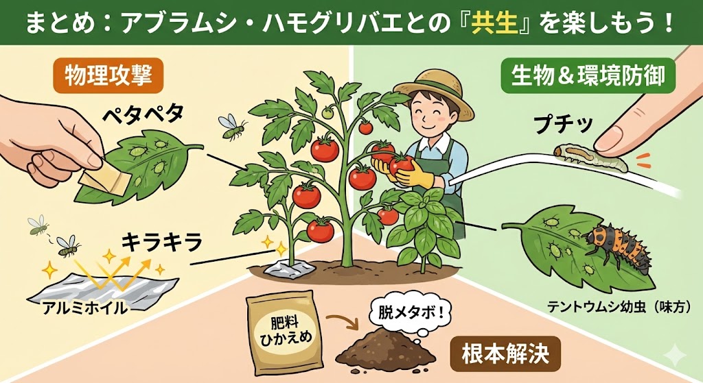 「虫がいる=失敗」ではありません。虫が来るほど、あなたのトマトが美味しく育っている証拠でもあります。 粘着テープ片手にパトロールする時間も、箱庭菜園の「イベント」として楽しんでしまいましょう!
