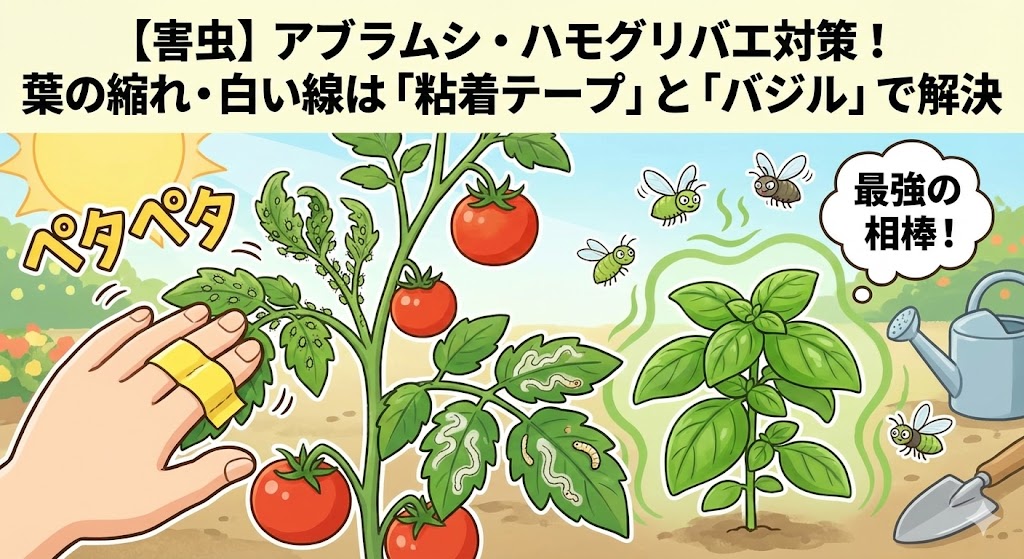 【トマトの害虫】アブラムシ・ハモグリバエ対策!葉の縮れ・白い線は「粘着テープ」と「バジル」で解決