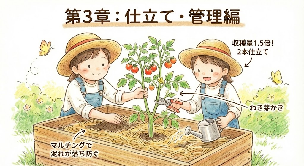 👉 仕立て方: 収穫量が1.5倍に増える「2本仕立て」とは?元気な脇芽をあえて残して主枝にする応用テクニック。