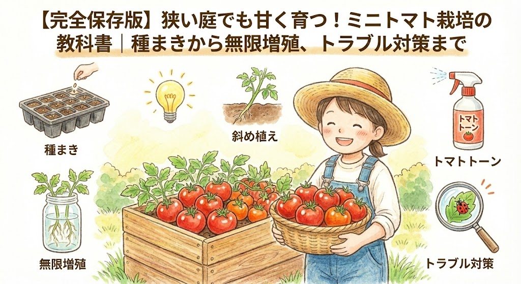 この記事は、品種選びから日々の管理、トラブル対策、そして収穫後の種採りまで、「はこにわ菜園」が実践するトマト栽培のノウハウを全22記事で体系的にまとめた「栽培の完全ロードマップ」です。