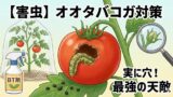 - 実に穴を開ける天敵「オオタバコガ」 ヘタの近くに小さな穴が空いていたら要注意。幼虫が実の中に潜り込んで食い荒らしています。中に入られると薬剤も効かないため、見つけ出して捕殺するか、防虫ネットで親(蛾)を寄せ付けないことが重要です。 👉オオタバコガ: 実に穴を開ける最悪の天敵。中に入られたら終わり?発見方法と防虫ネットによる防御策。
