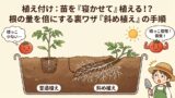 👉 植え付け: 苗を「寝かせて」植える!?根の量を倍にして強健に育てる裏ワザ「斜め植え」の手順。