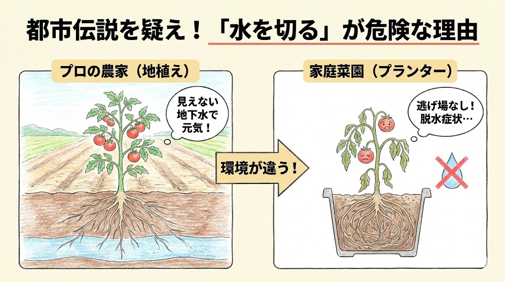 これを信じた真面目な初心者さんが、心を鬼にして水を断ち、結果としてトマトをカラカラに枯らしてしまったり、「尻腐れ(しりぐされ)」という病気にしてしまったりする悲劇が、毎年後を絶ちません。