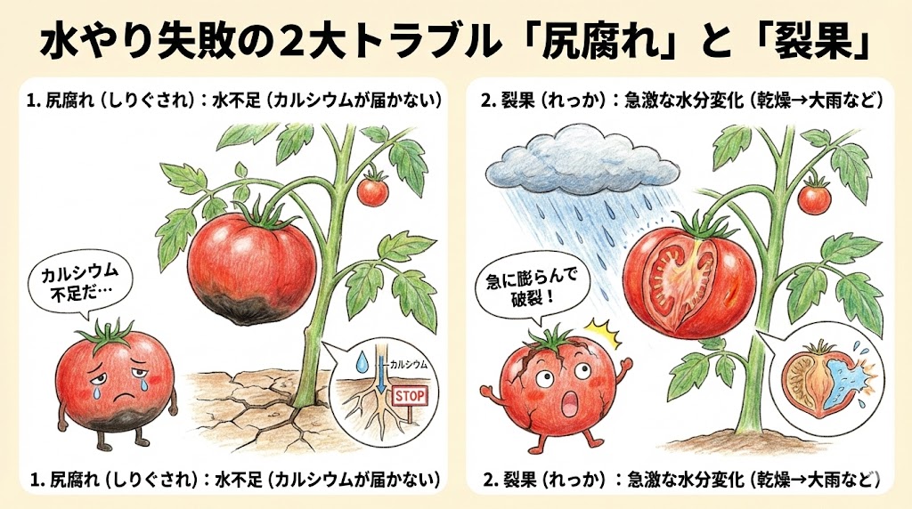水やりの失敗は、単に「枯れる」だけではありません。 せっかく実ったトマトを、食べる直前で台無しにしてしまう恐ろしい症状を引き起こします。 代表的な2つのトラブルを知っておきましょう。