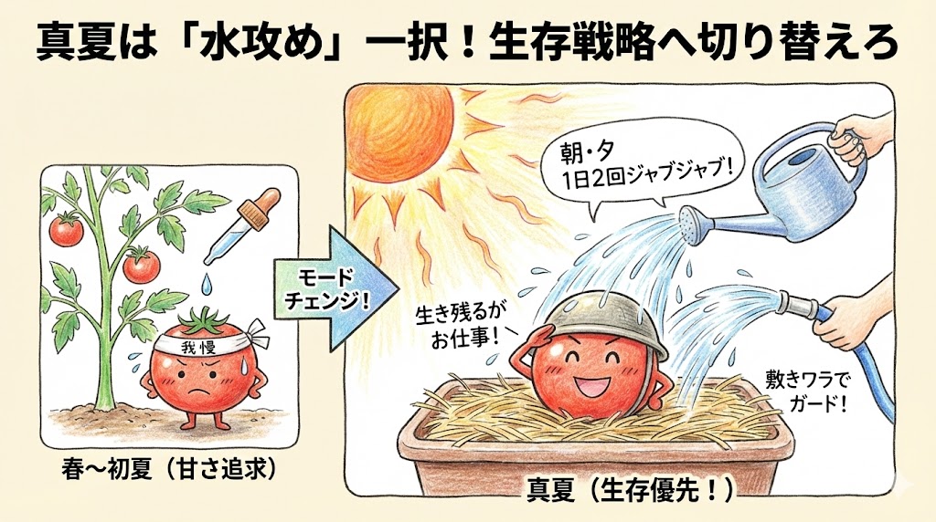 梅雨が明け、気温が30℃を超える真夏(7月中旬〜8月)に突入したら、これまでの話はすべて忘れてください。 「水を切って甘くする」なんて悠長なことを言っている場合ではありません。