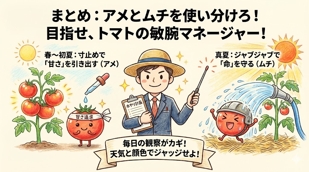 「甘くしたい」という欲と、「枯らしたくない」という親心。 この2つの気持ちの間で揺れ動きながら、その日の天気やトマトの顔色を見て判断する……。 まさに、あなたはトマトの「敏腕マネージャー」そのものです。