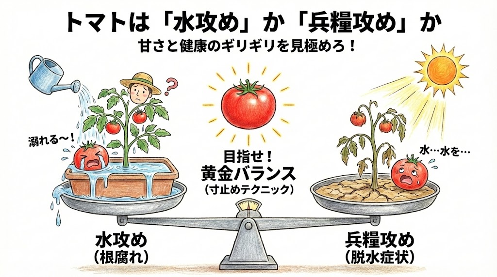 トマトは「水攻め」か「兵糧攻め」か。甘くするために水を切るタイミングと、しおれのリスク管理