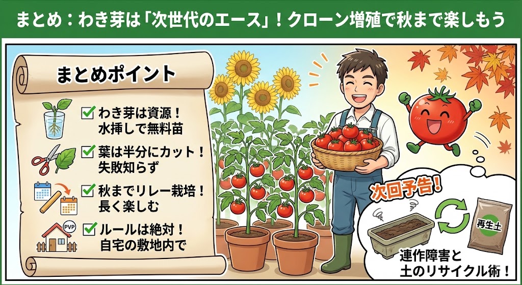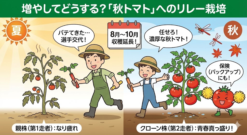 - 秋まで楽しむ: 親株とクローン株で「リレー栽培」を組み、濃厚な秋トマトを味わう。