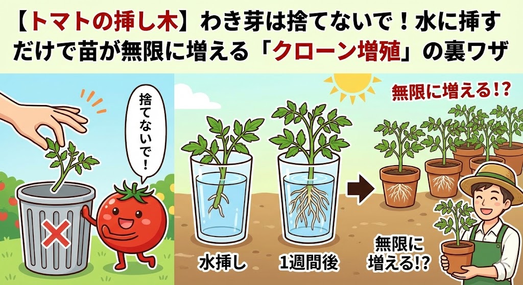 - ゴミじゃない、資源だ: 元気なわき芽は、水に挿すだけで「無料の苗」になる。