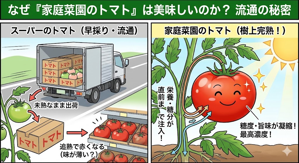 市販品が「色づくのを待っている」のに対し、家庭菜園のトマトは「ギリギリまで栄養を詰め込んでいる」。 この密度の違いが、口に入れた瞬間の「濃さ」の決定的な差となるのです。