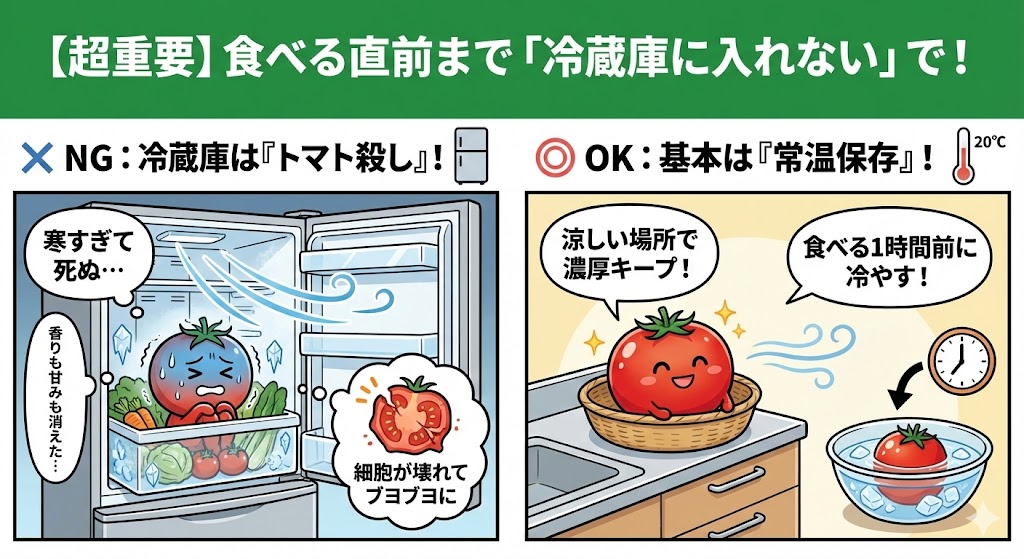 せっかく樹上で完熟させ、最高潮に達したトマトの美味しさを、冷蔵庫の寒さが台無しにしてしまう可能性があります。 これは、トマト栽培のゴールテープを切る直前の、最後の落とし穴です。