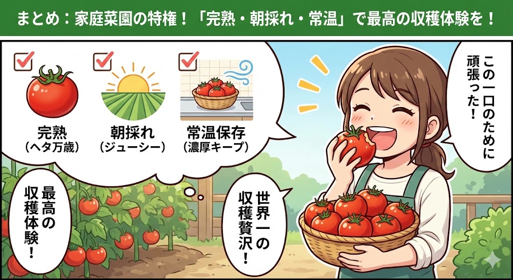今回ご紹介した「完熟(ヘタの万歳)・朝採れ・常温保存」の3つのルール。 これらが揃ったトマトを食べられるのは、世界中でたった一人、それを育てたあなただけです。
