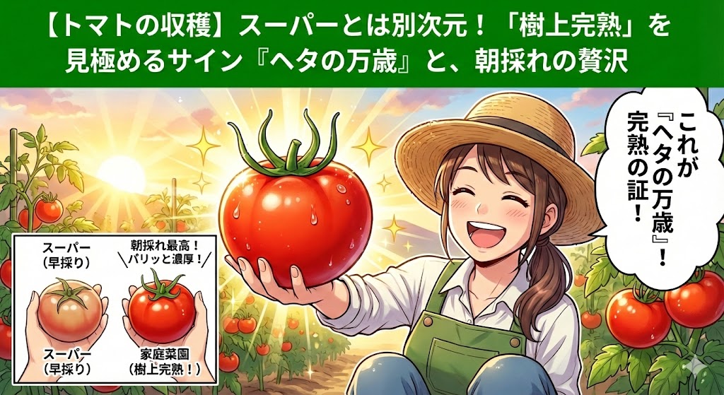 今回は、トマトが最高に美味しくなった瞬間にだけ見せるサイン「ヘタの万歳」と、プロがこだわる「収穫の時間帯」について解説します。 数ヶ月間の努力が報われる「最高の一口」のために、最後の見極めをマスターしましょう!