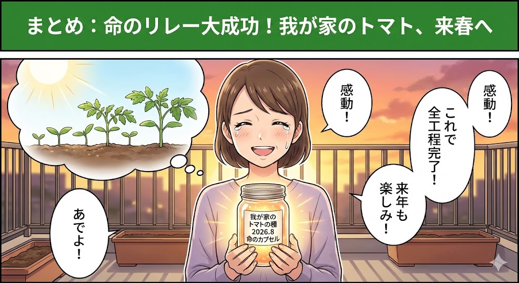 自分で育てたトマトから種を採り、また翌年にその種を蒔く。 この「命のリレー」こそが、家庭菜園の究極のゴールであり、最もロマンを感じる瞬間です。これが成功すれば、もう苗を買う必要はありません。まさに「無限トマト」の完成です!