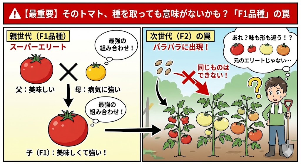 もし「ホームセンターで買った、病気に強くて美味しい苗」なら、それは十中八九「F1品種」です。 実は、F1品種から種を取って育てても、来年同じトマトが育つとは限らないのです。
