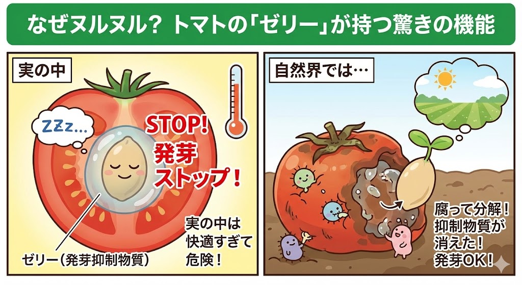 トマトの実の中は、水分がたっぷりで栄養も豊富、温度も適度です。 もし、何の制限もなければ、種は「おっ、ここは快適だ! 今すぐ芽を出そう!」と勘違いして、実の中で発芽してしまいます。 (これを「胎内発芽(たいないはつが)」と言います)。