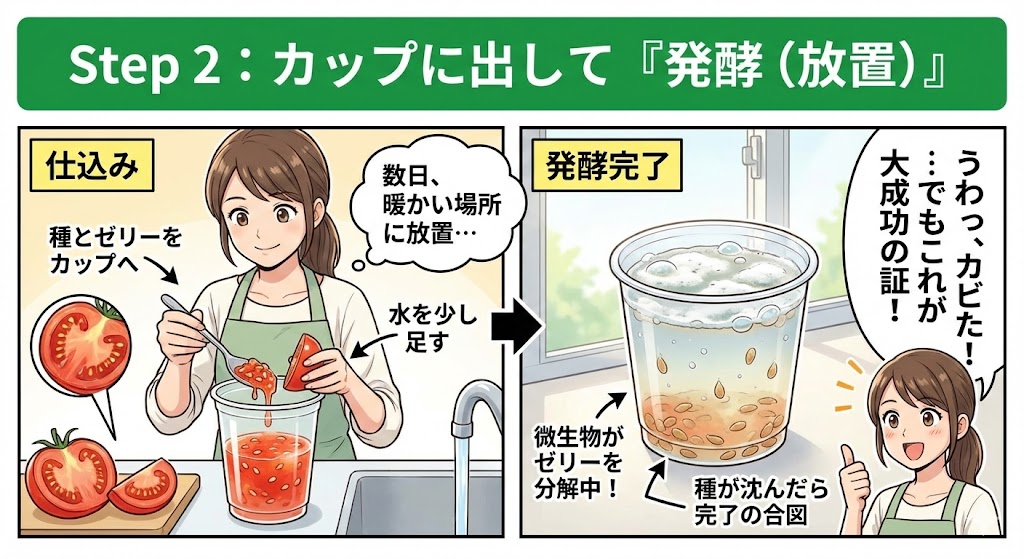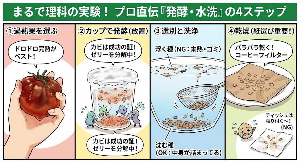 2. あえて腐らせる: 種の周りのゼリーは発芽抑制物質。水洗いだけでなく「発酵」させて取り除くのがプロの技。