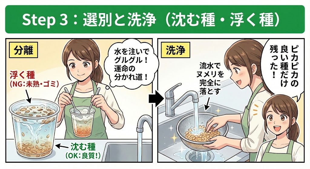 3. 浮いているもの(カビ、ゴミ、未熟な種)を水と一緒に捨てます。