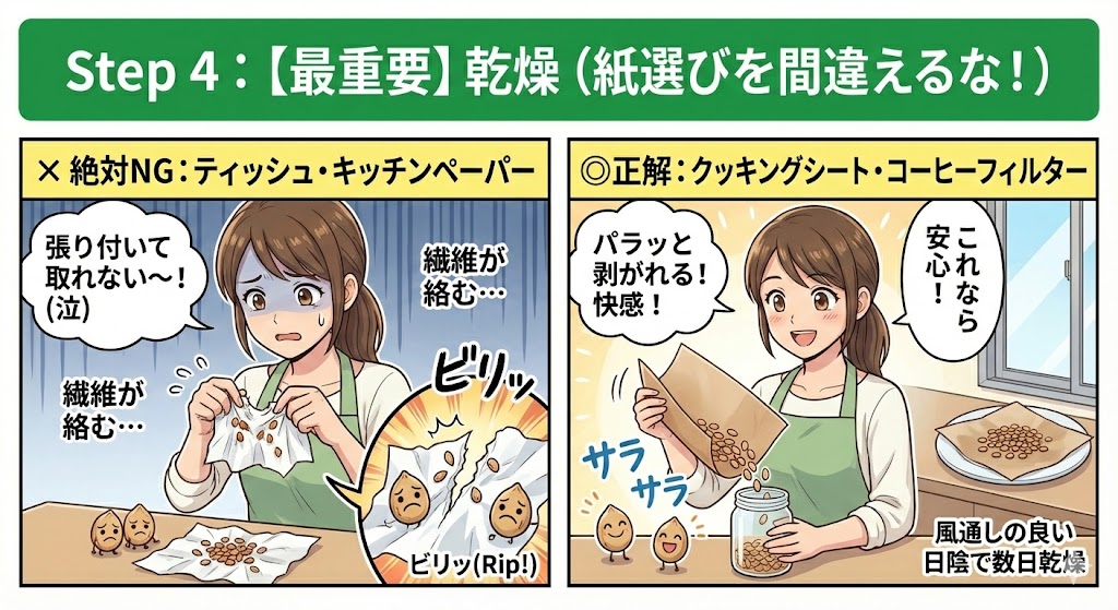 きれいになった種を乾燥させますが、ここで初心者の9割がハマる「罠」があります。