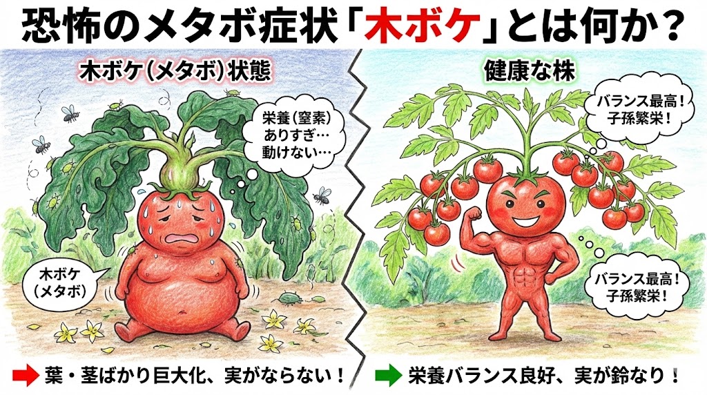 トマト栽培で最も陥りやすい失敗、それが「木ボケ(きぼけ)」です。 字面だけ見ると「木がボケっとしている」ような可愛いイメージですが、実際はトマトにとって、そして収穫を楽しみにしている私たちにとって、非常に深刻な状態です。