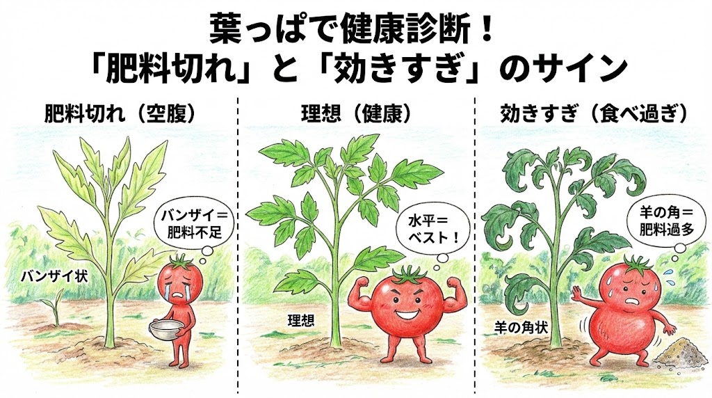 「2週間に1回って決めたけど、本当に今あげていいのかな?」 迷った時は、トマトの「葉っぱ」を見てください。 トマトは言葉を話せませんが、葉の色や角度で「お腹すいた!」「もう食べられない!」と猛烈にアピールしています。