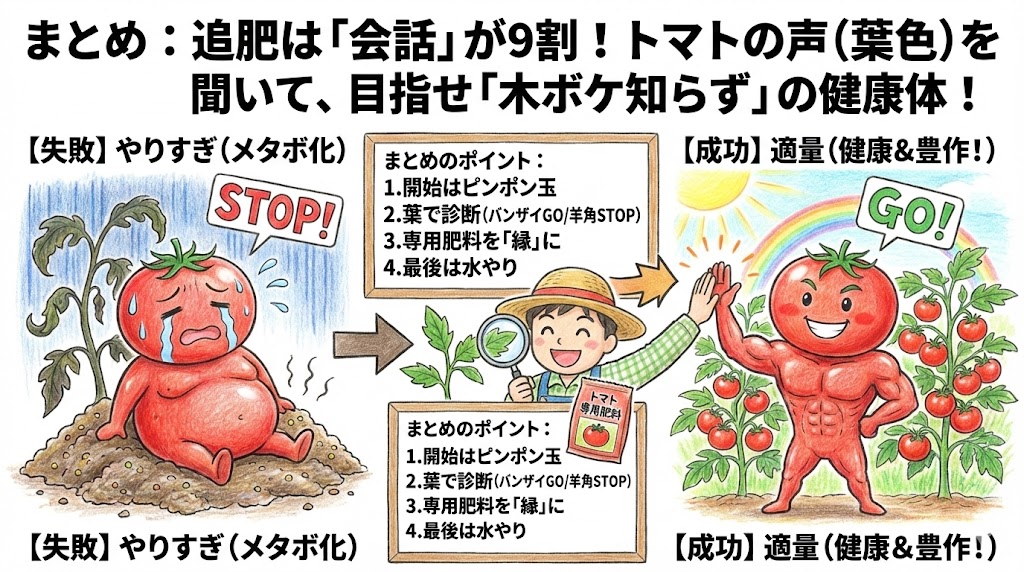 カレンダーの日付にとらわれず、毎朝トマトの顔色(葉の様子)を見て、「お、今日はお腹が空いてそうだな」「ちょっと食べすぎかな?」と判断できるようになれば、あなたはもう立派なトマトマスターです。