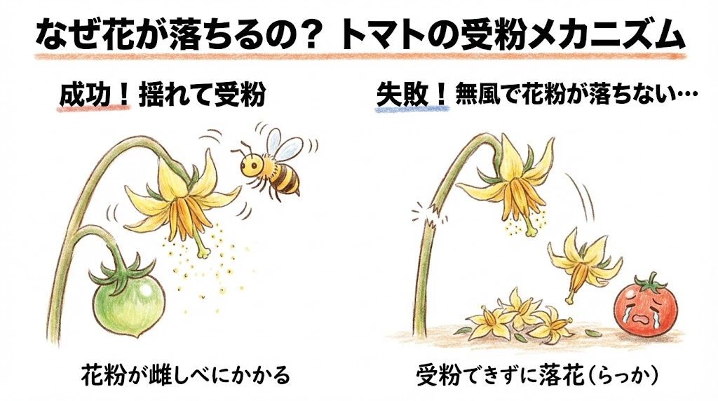 このように、人間にとっては快適で穏やかな環境も、トマトにとっては「静かすぎて受粉できない環境」になりがちです。 受粉のチャンスを待ち続けても揺れが来ず、タイムリミットが来ると、トマトは「これ以上栄養を送っても無駄だ」と判断し、花を根元からポロリと落としてしまいます。