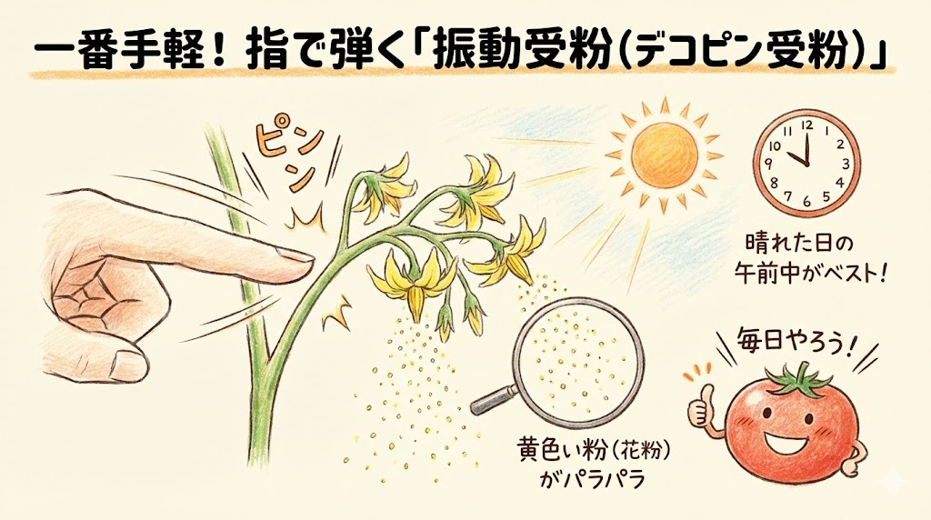 - 支柱を叩く(おすすめ): 花に触れるのが怖い場合は、トマトを誘引している「支柱」をトントンと叩いて揺らしてください。これなら花を傷つける心配がありません。