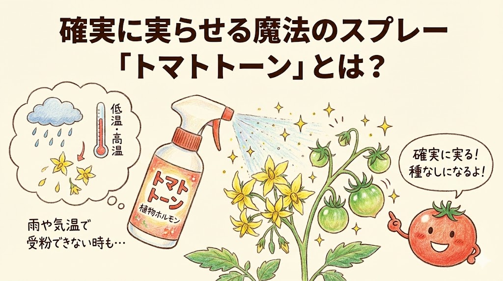 通常、トマトは受粉することによって「種(タネ)」ができ、その刺激でホルモンが出て実が膨らみ始めます。 トマトトーンは、このホルモンを外からシュッとかけてやることで、「おめでとう! 受粉したよ(勘違い)」とトマトに信じ込ませるアイテムです。