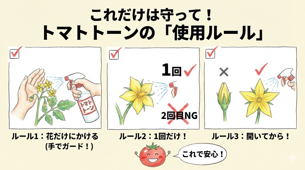 トマトトーンは非常に効果が高いぶん、使い方を間違えると株を傷めてしまう「副作用」も持っています。 人間のお薬と同じで、「用法・用量を守る」ことが大切です。 必ず守ってほしい、3つの鉄則を覚えておきましょう。