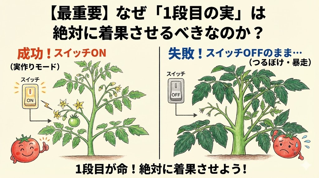 - 1段目を実らせることは、トマトの「暴走(つるぼけ)」を防ぐスイッチになる。