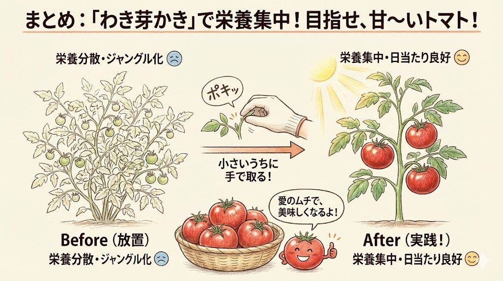 最初は、元気な芽を摘み取ることに罪悪感を感じるかもしれません。 しかし、ここまで読んでくださったあなたなら、もうお分かりですよね。それはトマトへの意地悪ではなく、「限られた栄養を、大切な実に届けるための愛」だということを。